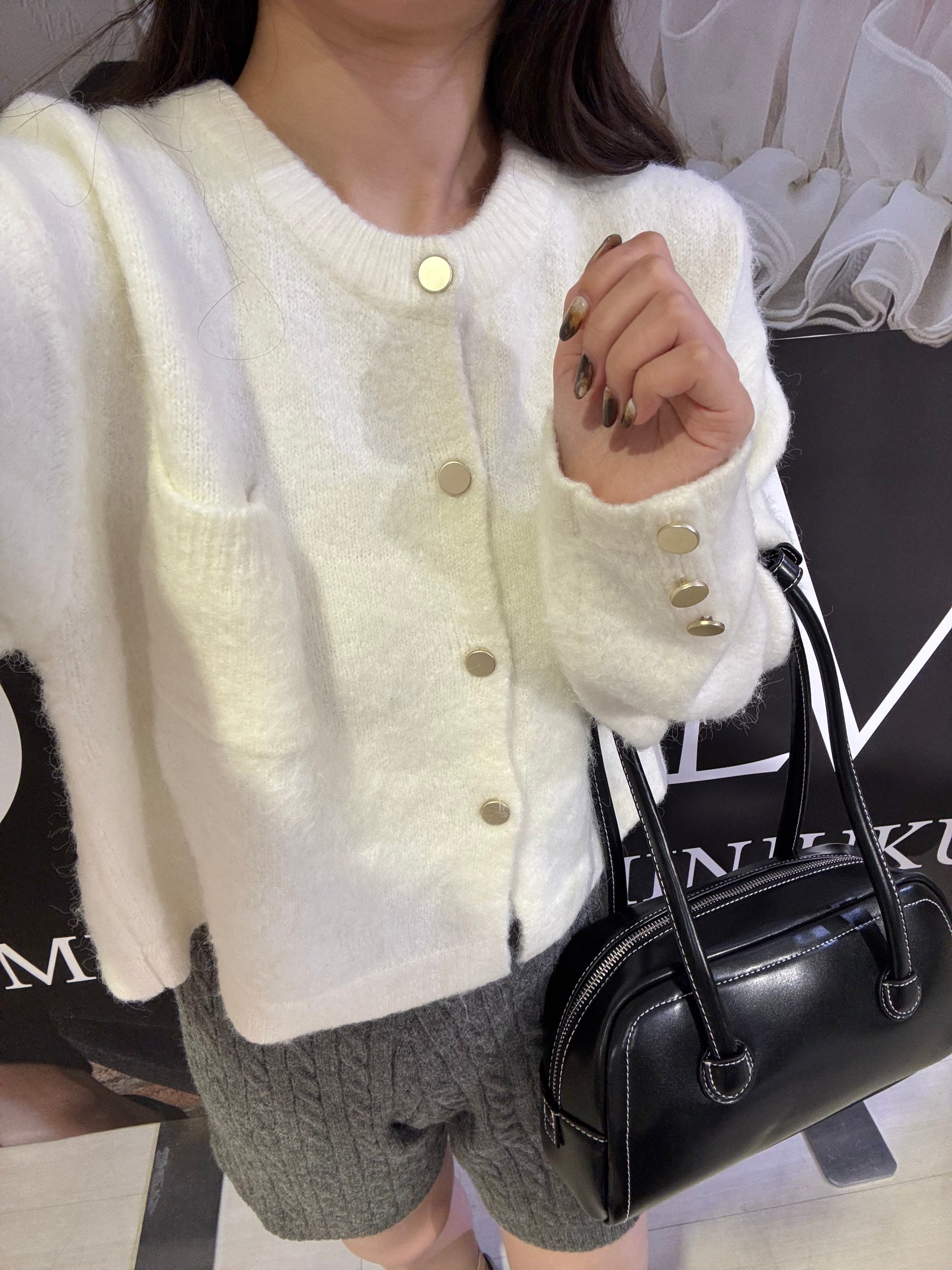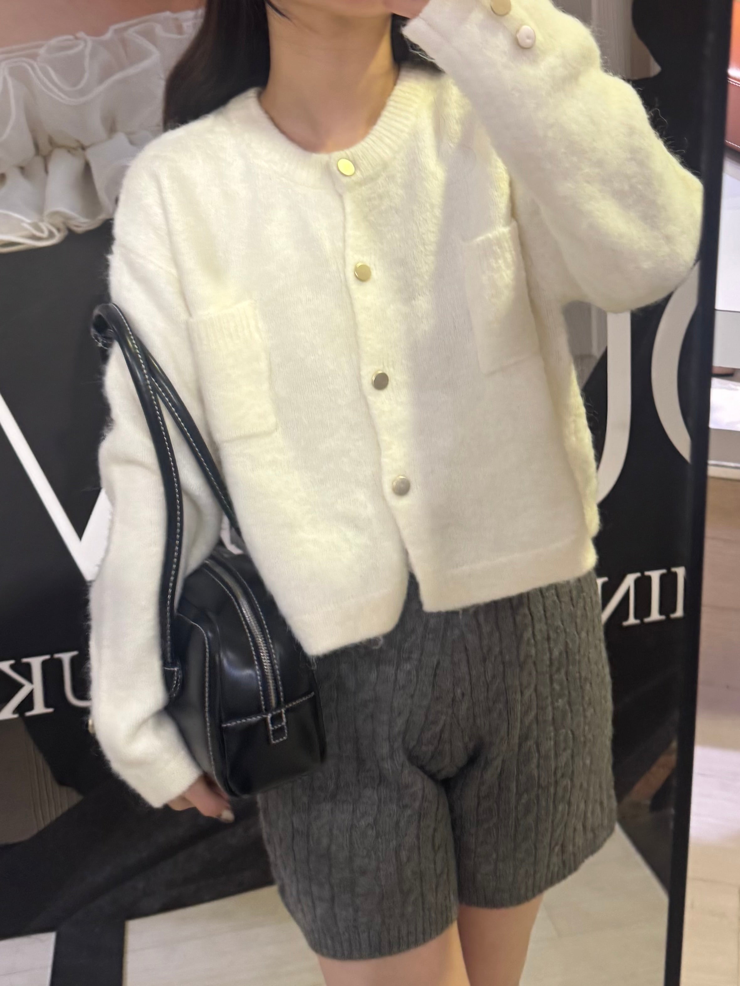 立体的なケーブル編みが可愛いカーディガンコーデ。 肩にマフラーをかけてアクセントに。