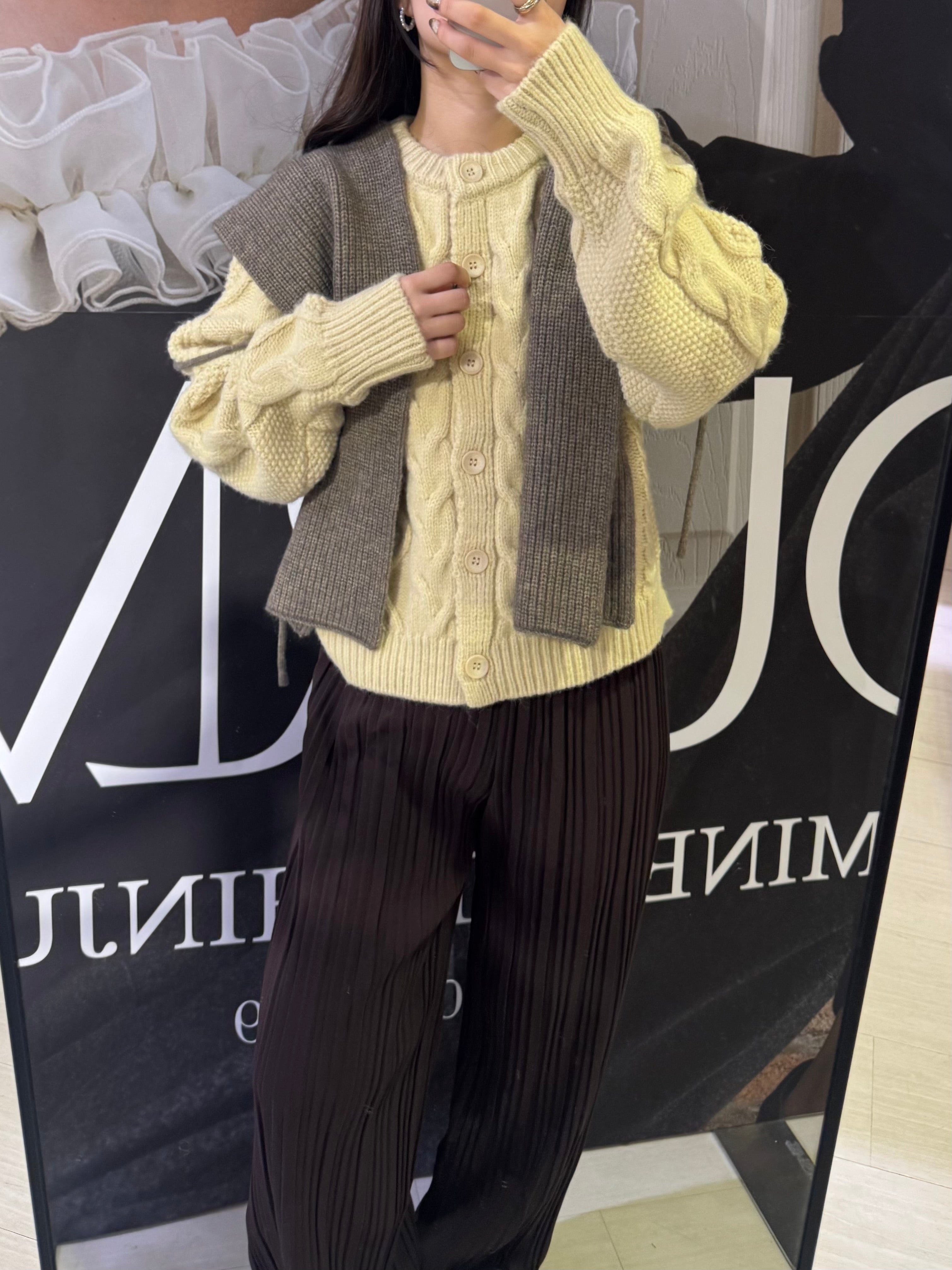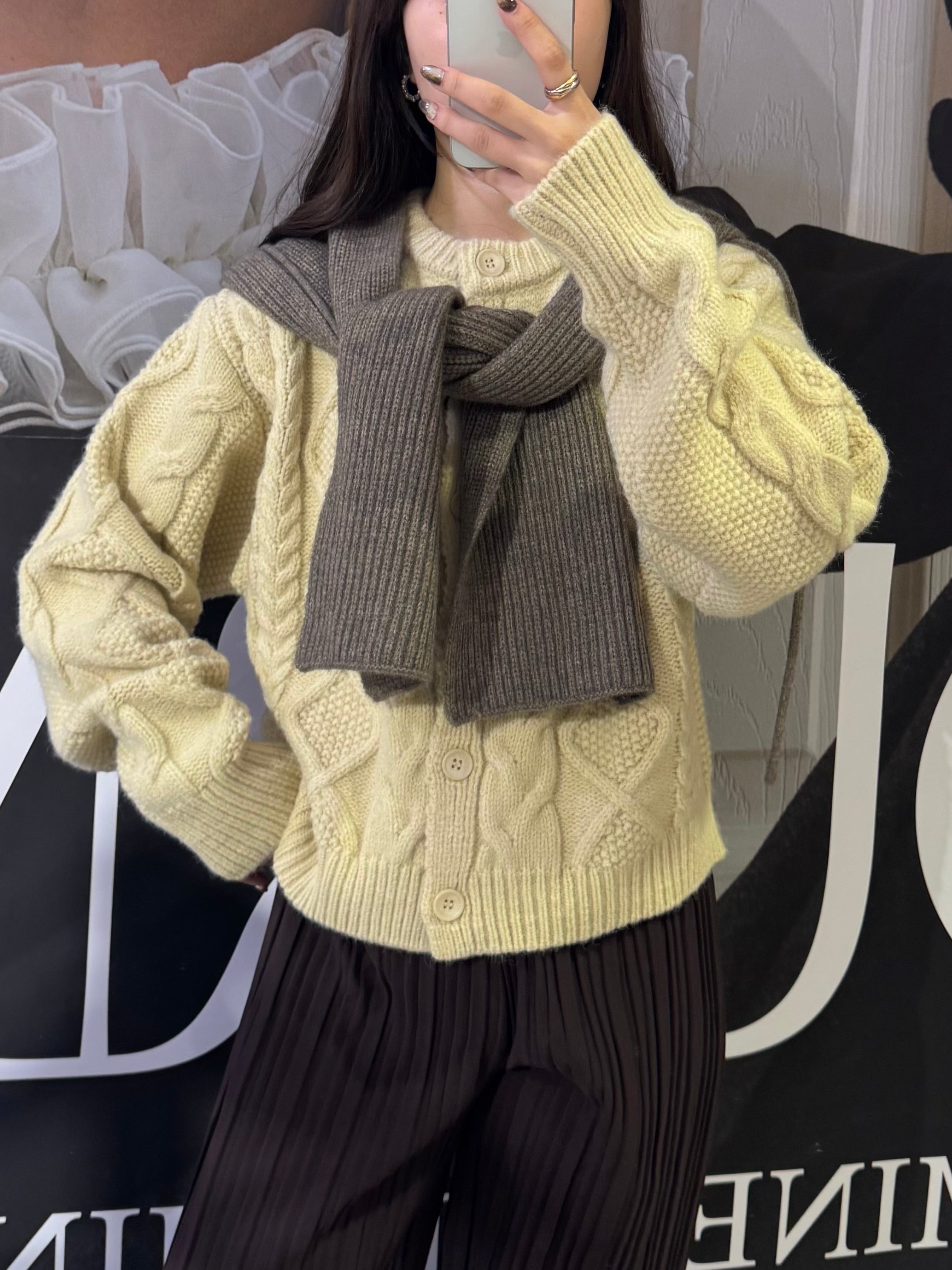 立体的なケーブル編みが可愛いカーディガンコーデ。