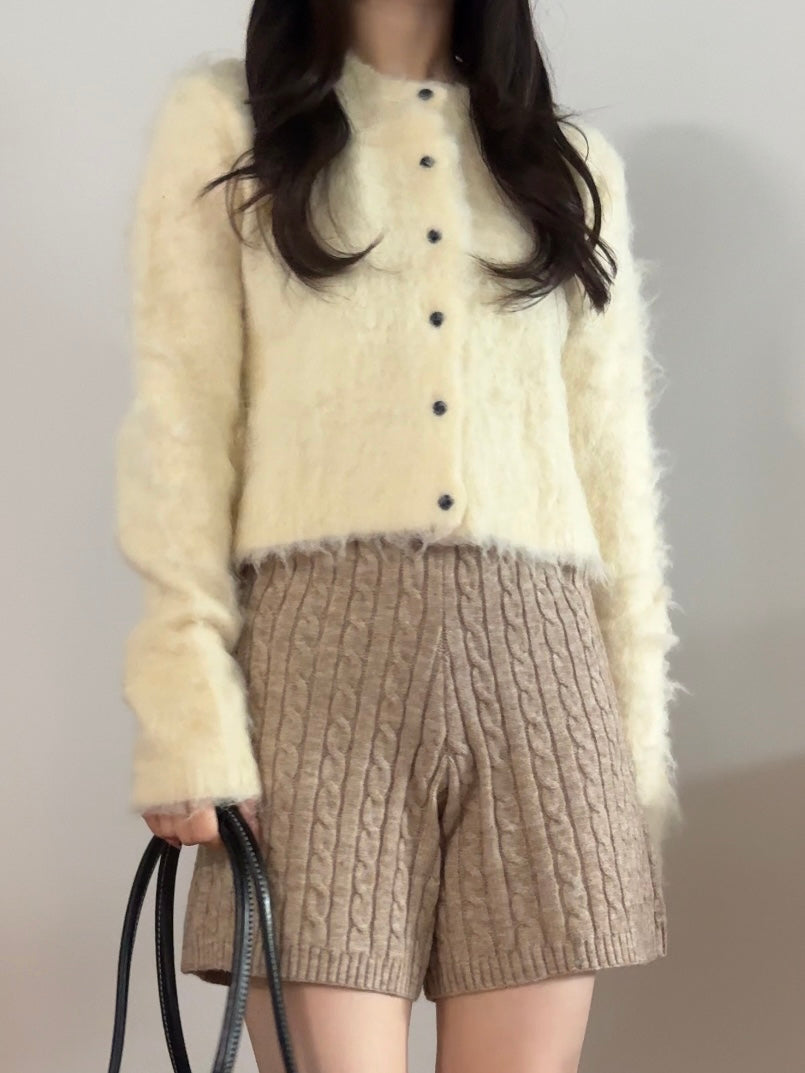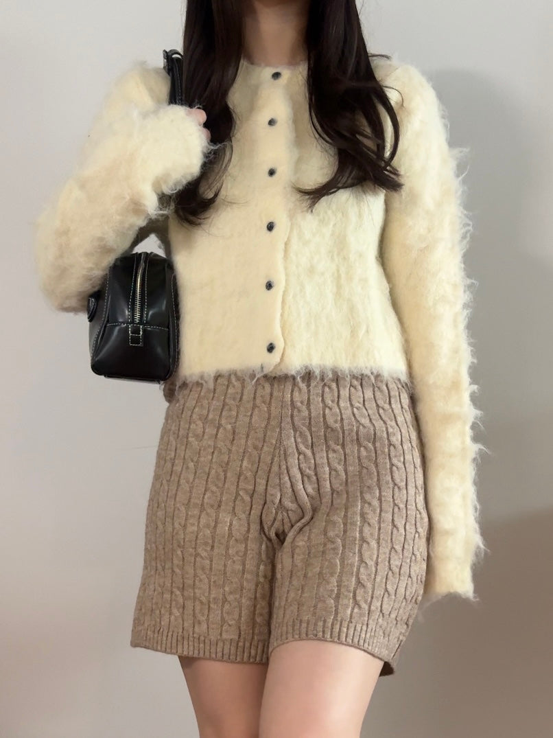 ふわふわシャギーのカーディガンがポイントな淡色コーデ。