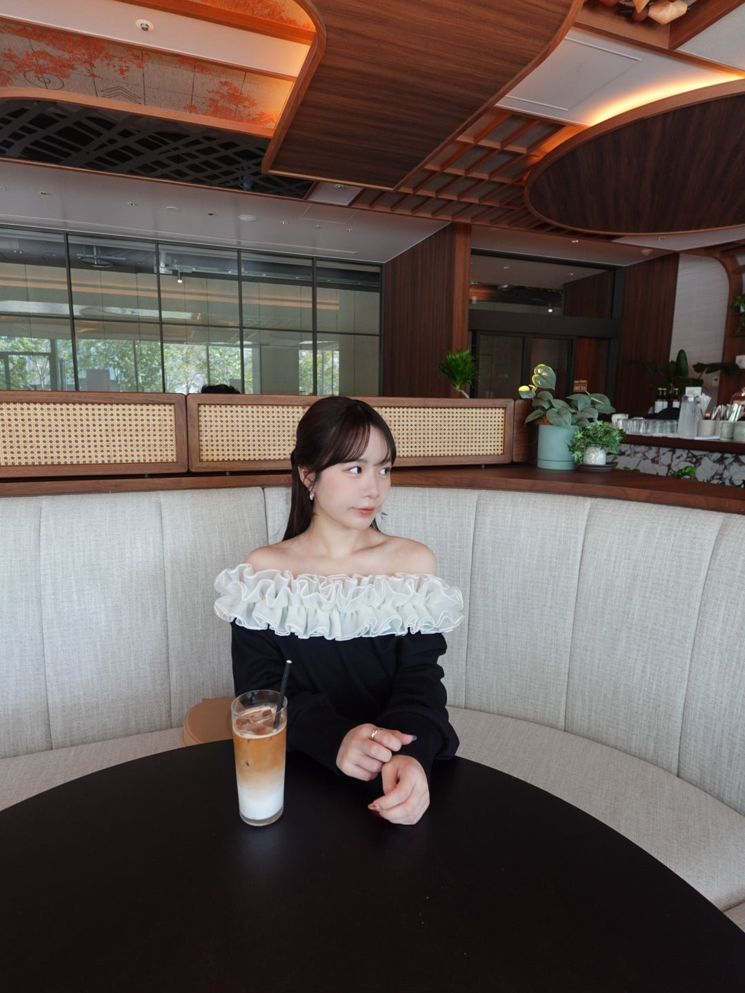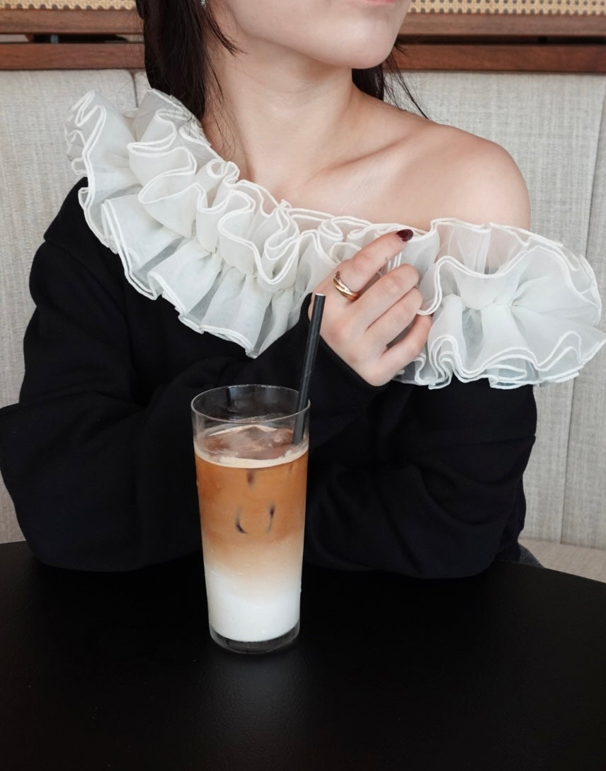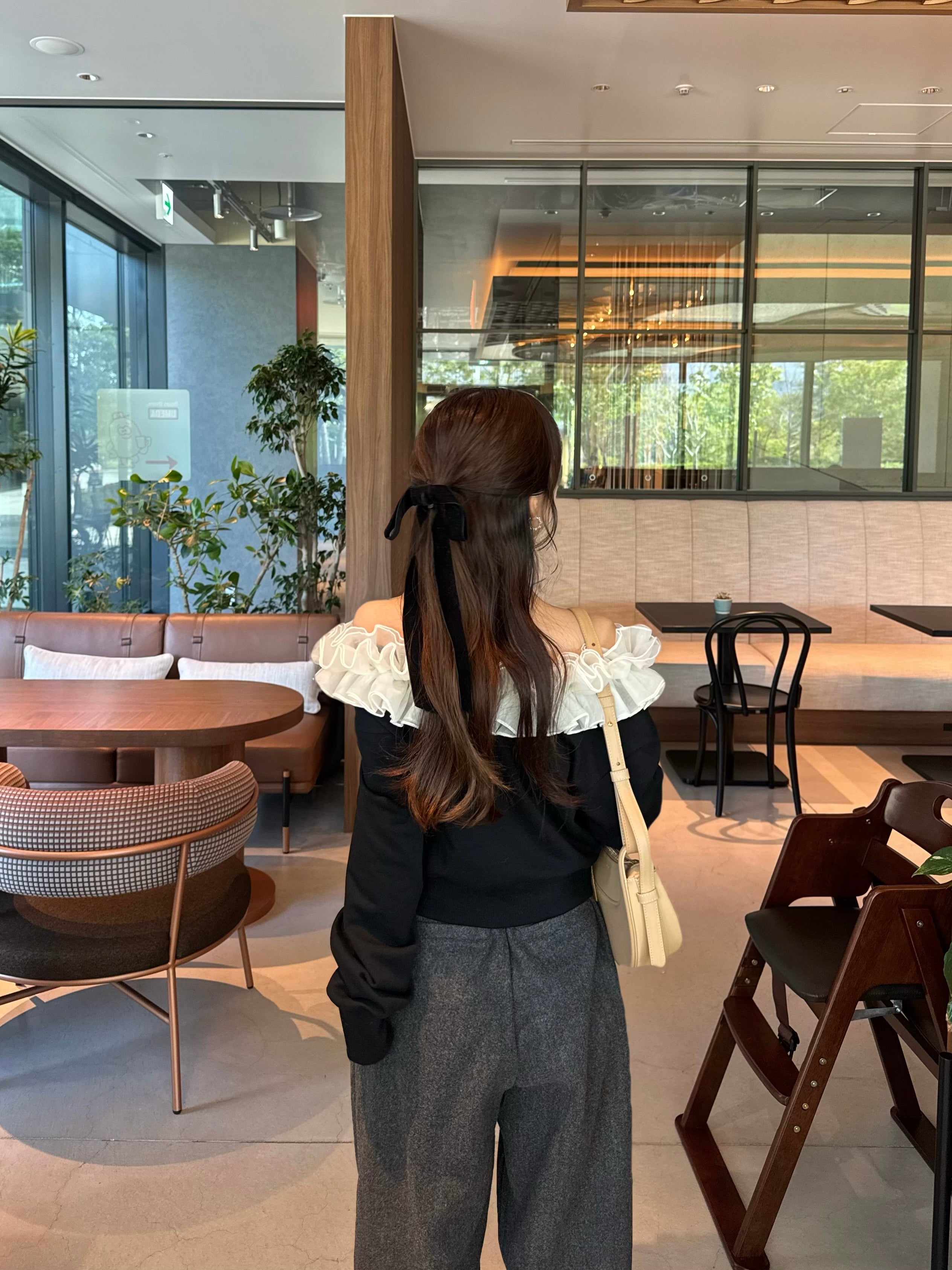 ワンショルとしても、オフショルとしても着られるフリルスウェットが主役のカフェコーデ。パンツと合わせて大人っぽくまとめました。