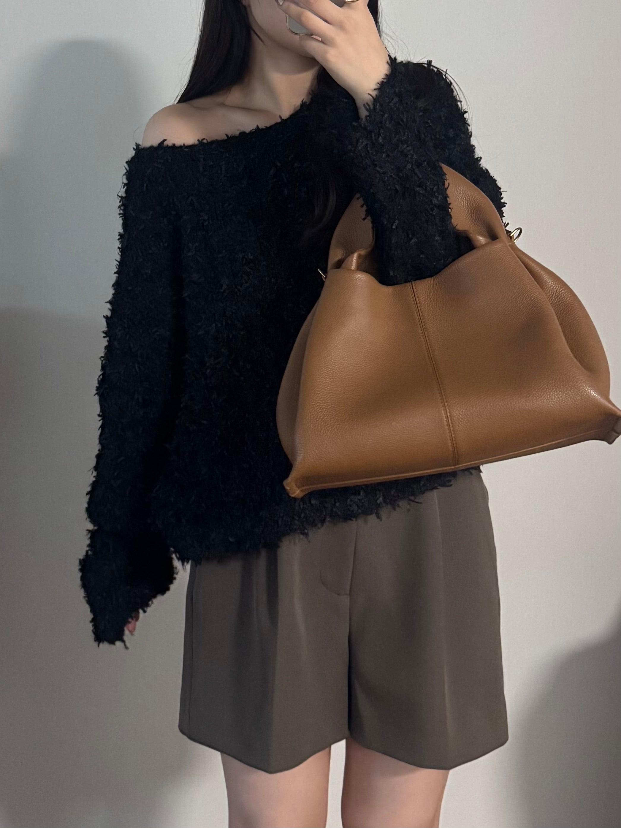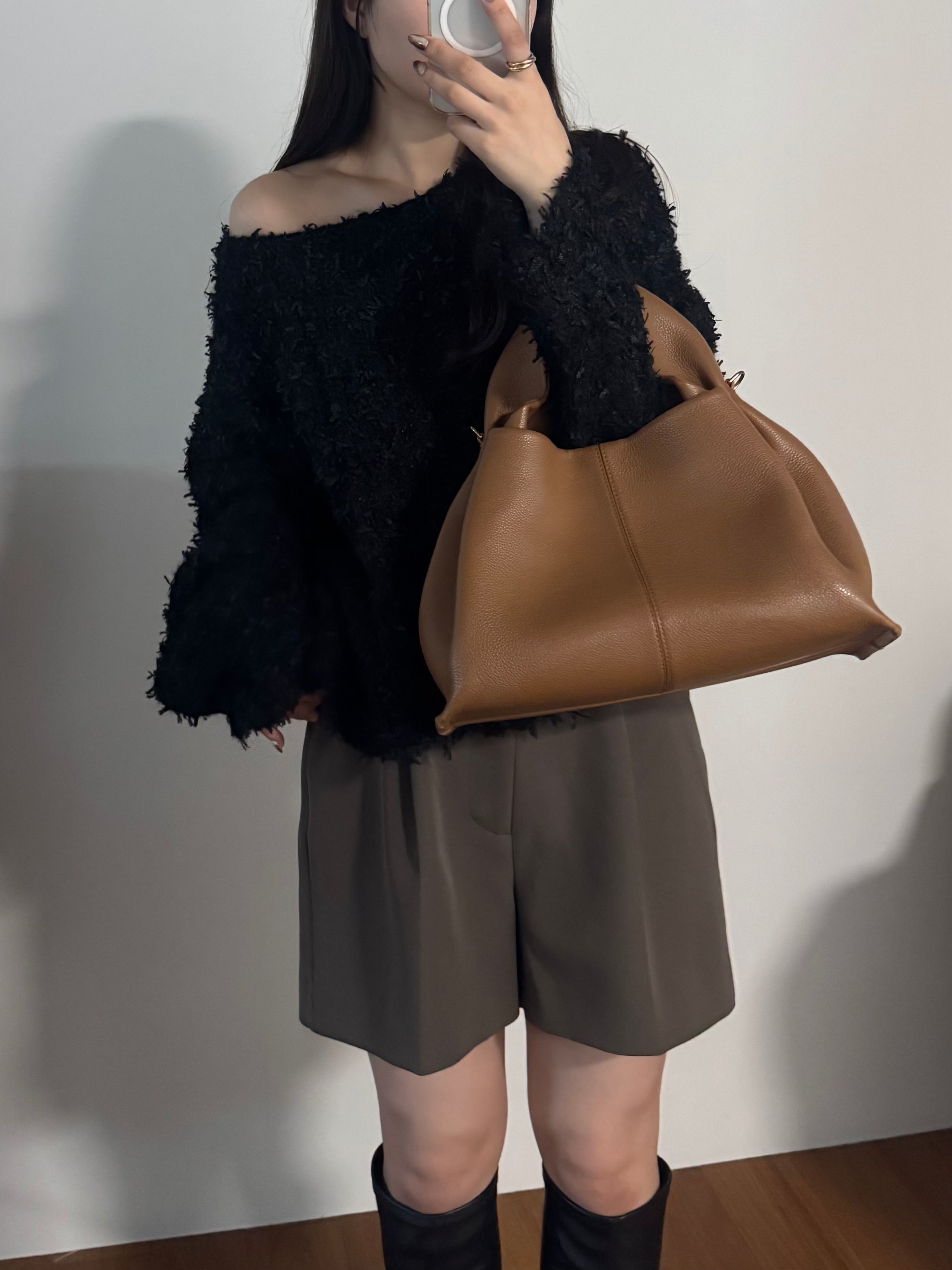 スエード生地のセットアップコーデ。 ハーフパンツとロングブーツの組み合わせがお気に入り。