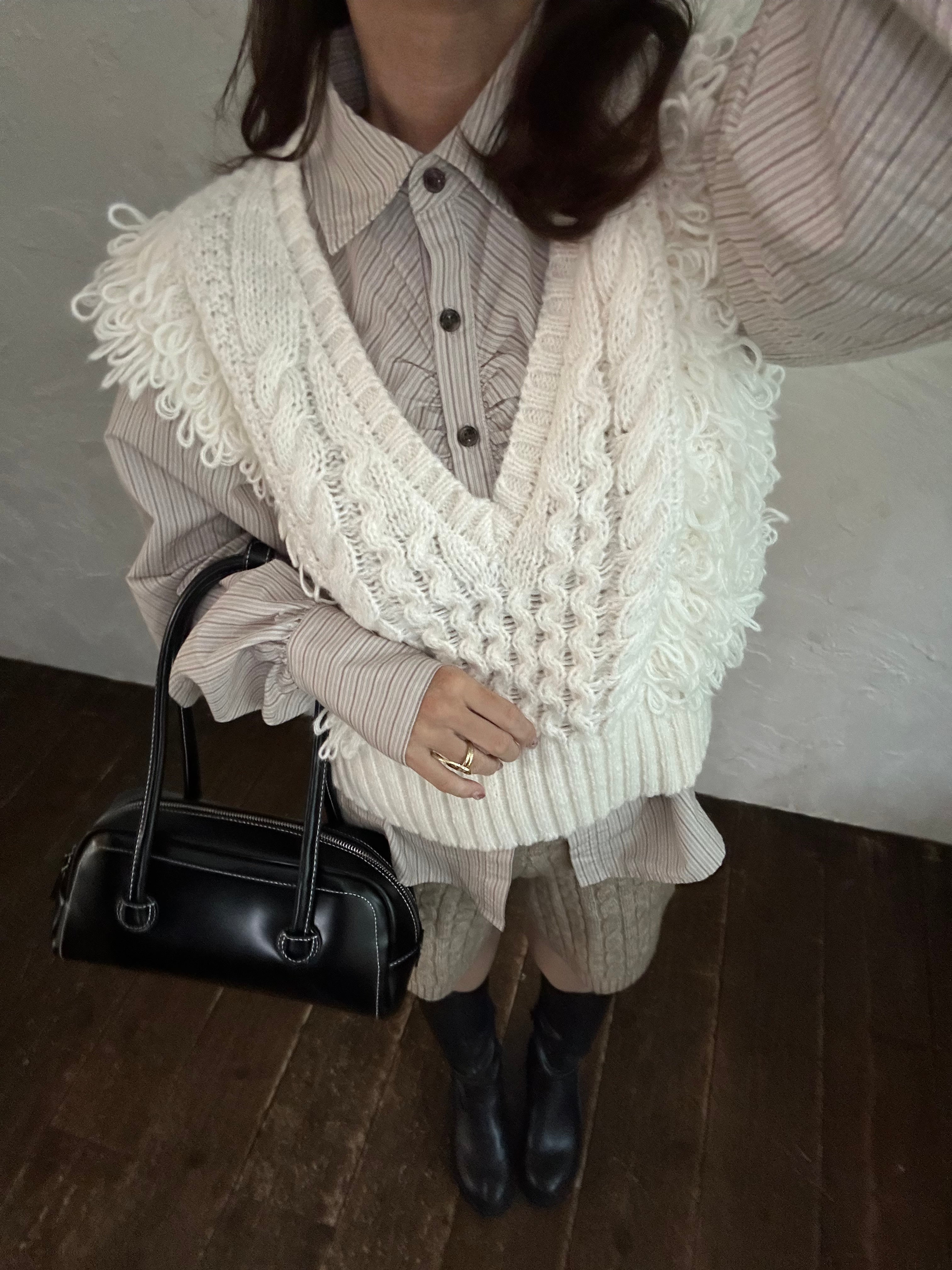ふわふわシャギーのカーディガンがポイントな淡色コーデ。 ロングブーツとの組み合わせもおすすめです。